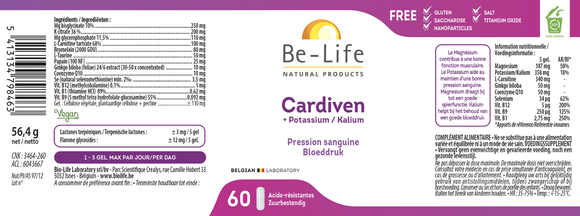 Magnesium bisglycinaat, Kalium Citraat, L-Carnitine tartraat, Magnesium glycerophosfaat, Ginkgo biloba, Bromélaïne, L-Taurine, Papaïne, Co-enzyme Q10, Selenium (L-Selenomethionine), Vitamine B1, Vitamine B12 (Methylcobalamine), Vitamine B9 (folaat), Magnesium stearaat, Plantaardige cellulose (capsule)