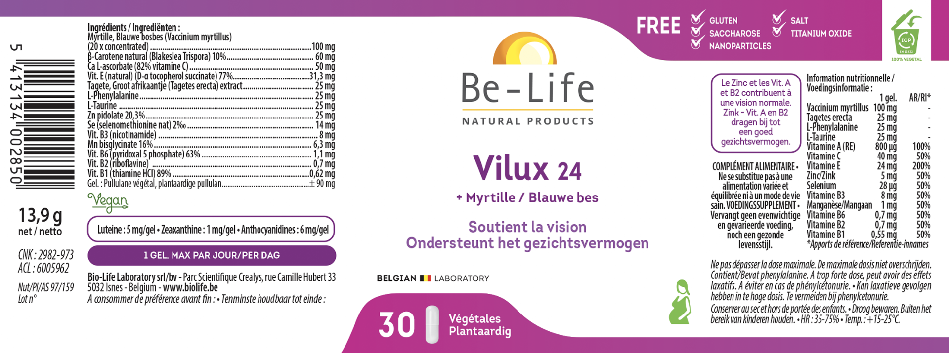 Blauwe Bes (Vaccinium myrtillus)extract 20/1, ß-Caroteen natuurlijke (Blakeslea Trispora) 10%, Calcium ascorbaat (82% Vitamine C), Vitamine E (natuurlijke) (D-alfa-tocoferolacetaat), Afrikaantje (Tagetes erecta) extract, L-Fenylalanine niet-GGO, L-Taurine niet-GGO, Zink pidolaat, Selenium (natuurlijke selenomethionine) 2%, Vitamine B3 (nicotinamide), Mangaan bisglycinaat 16%, Vitamine B6 (pyridoxal-5-phosphate), Vitamine B2 (riboflavine), Vitamine B1 (thiamine HCl) 89%,